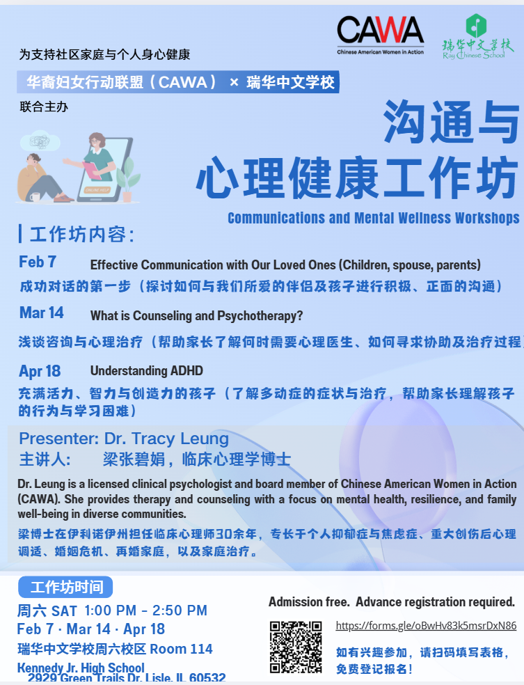 为支持社区家庭与个人的身心健康,华裔妇女行动联盟(CAWA)将于春季学期携手瑞华中文学校联合主办三场以沟通与心理健康为主题的工作坊。本系列讲座将由资深临床心理学博士 Dr. Tracy Leung(梁张碧娟博士)主讲,内容贴近家庭与社区实际需求,帮助参与者提升沟通能力并加深对心理健康的理解。 欢迎感兴趣的家长及社区朋友扫码填写表格,免费登记参加。